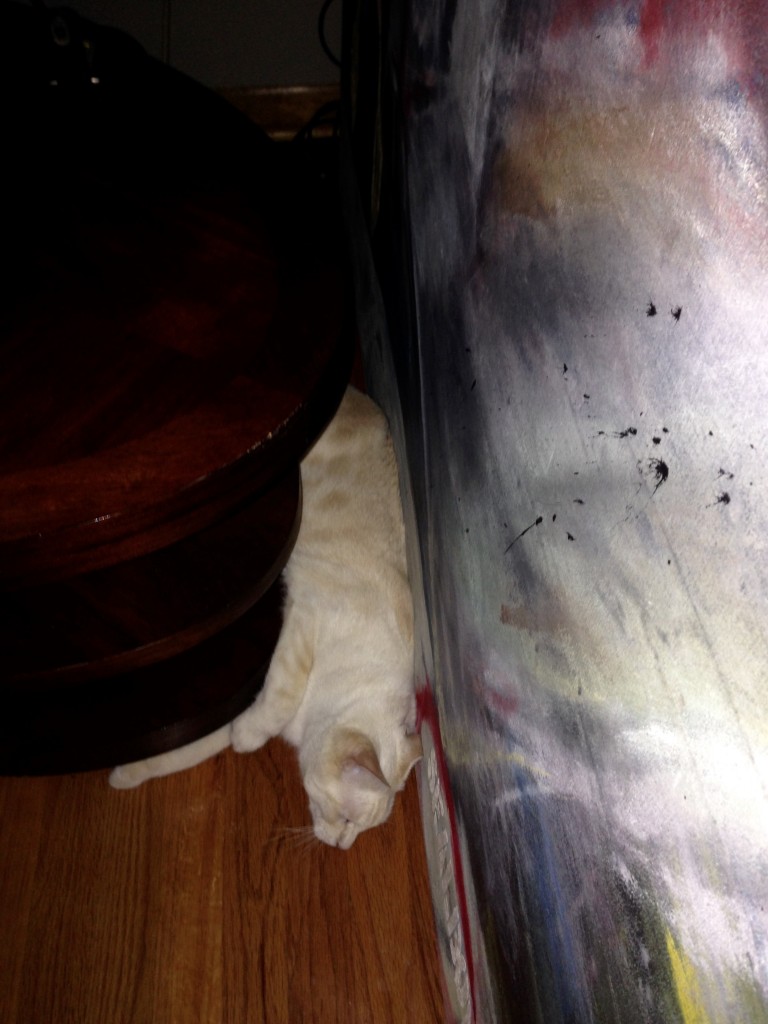And so, I’m testing a darker fuchsia in the living room. Mister Kitty has been quick to help. My plan was to test a patch behind the painting, but I’m not fooling anyone. That whole wall will need color, and several coats from the look of things.